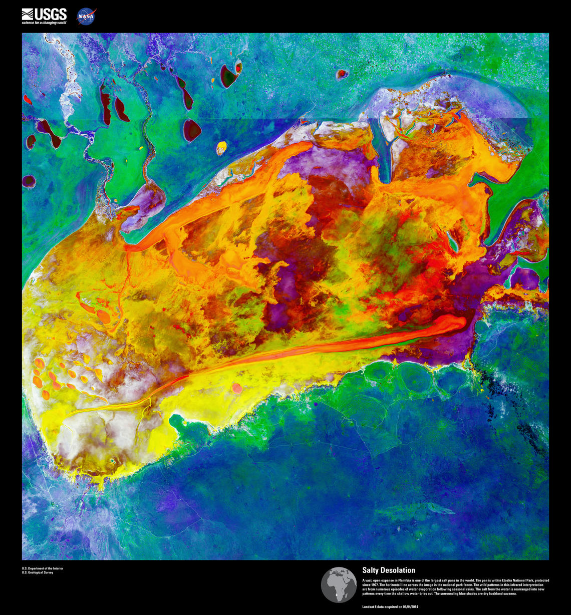 A vast, open expanse in Namibia is one of the largest salt pans in the world. The pan is within Etosha National Park, protected since 1907. The horizontal line across the image is the national park fence. The wild patterns in this infrared interpretation are from numerous episodes of water evaporation following seasonal rains. The salt from the water is rearranged into new patterns every time the shallow water dries out. The surrounding blue shades are dry bushland savanna.