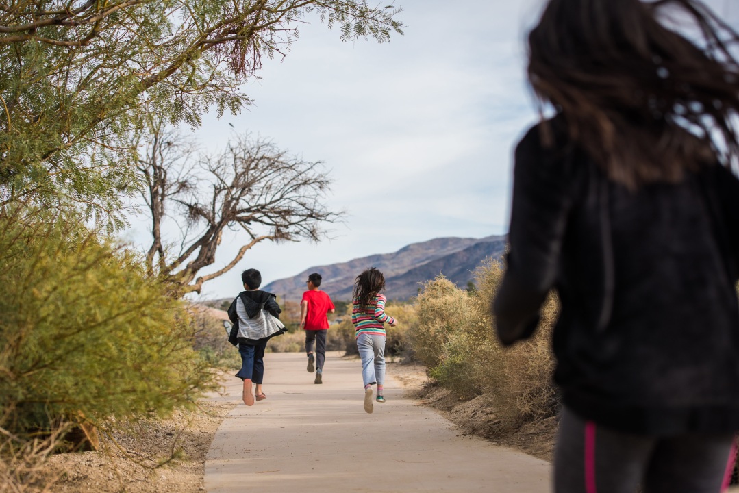 Kids running at the Oasis of Mara in Joshua Tree National Park.