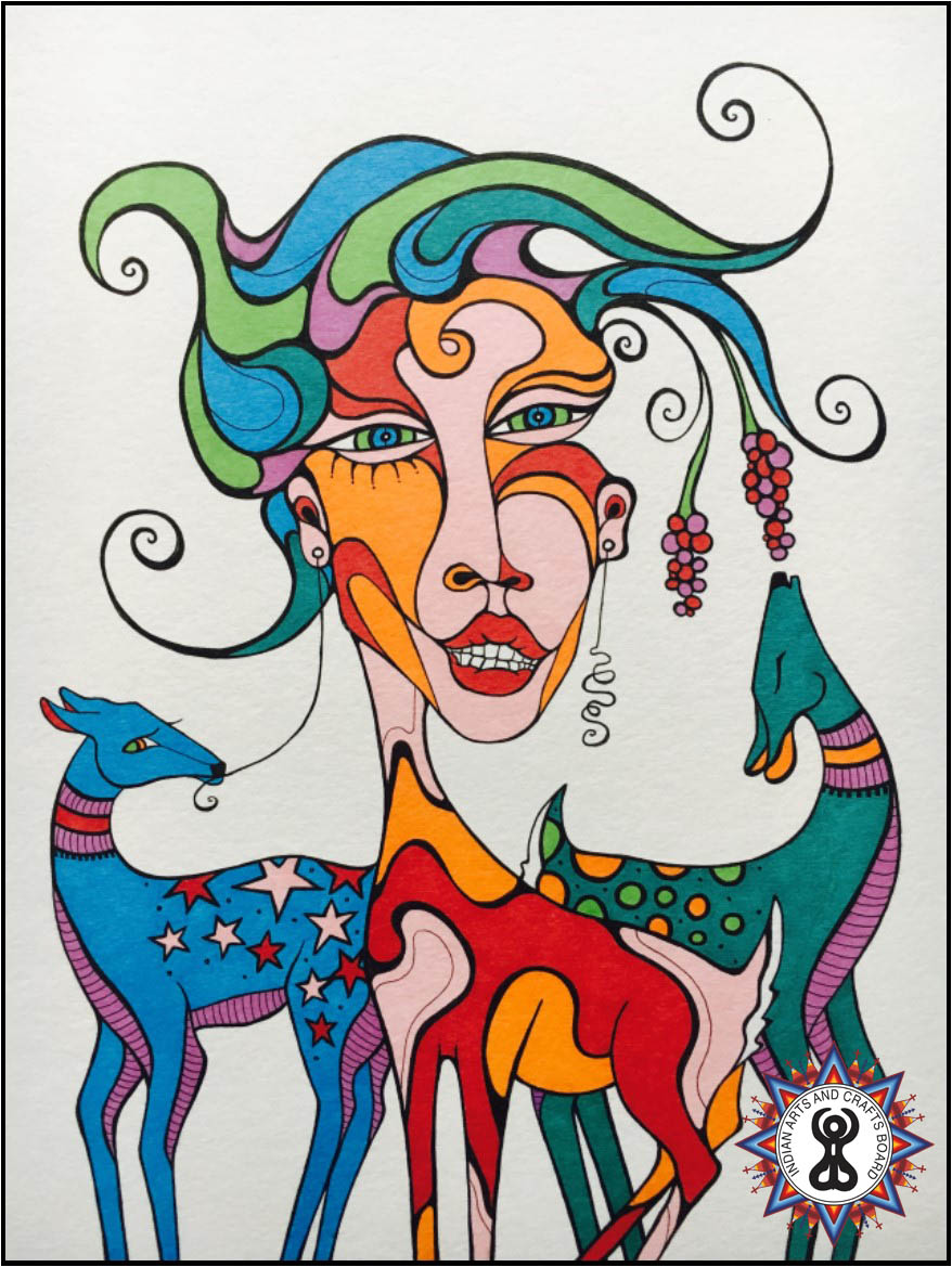 Inspiration for Ms. Gordon’s work comes from a variety of sources including: nature, music, Lakota culture, and human emotions.  She often creates her work spontaneously, allowing her ideas to flow on paper or canvas.  When drawing, after laying out the design in pencil on watercolor paper or Bristol board, she uses Micron inks to overlay the pencil lines.  She then adds acrylic inks and Prisma colors to create depth in the final image.  In her paintings, Ms. Gordon uses acrylic paints on canvas or wood panels.  Recently, she has begun experimenting with the uses of watercolors and collage techniques.