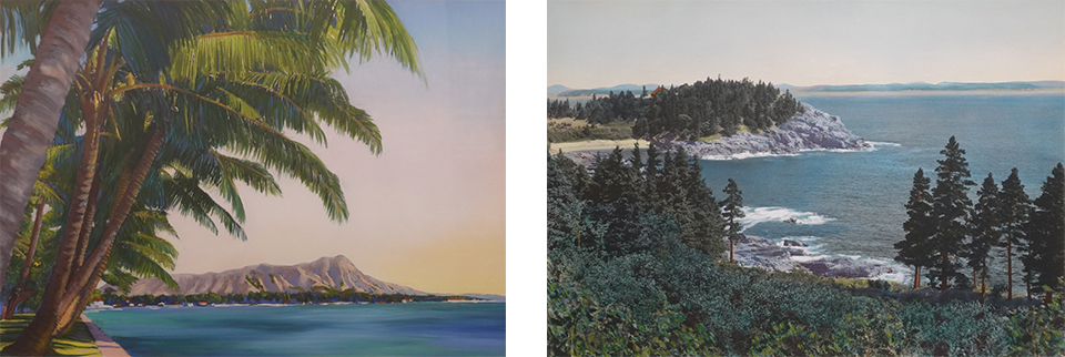 Left:  Diamond Head, Oahu, Hawai‘i, hand-tinted photograph, circa 1935, 14" x 20"
