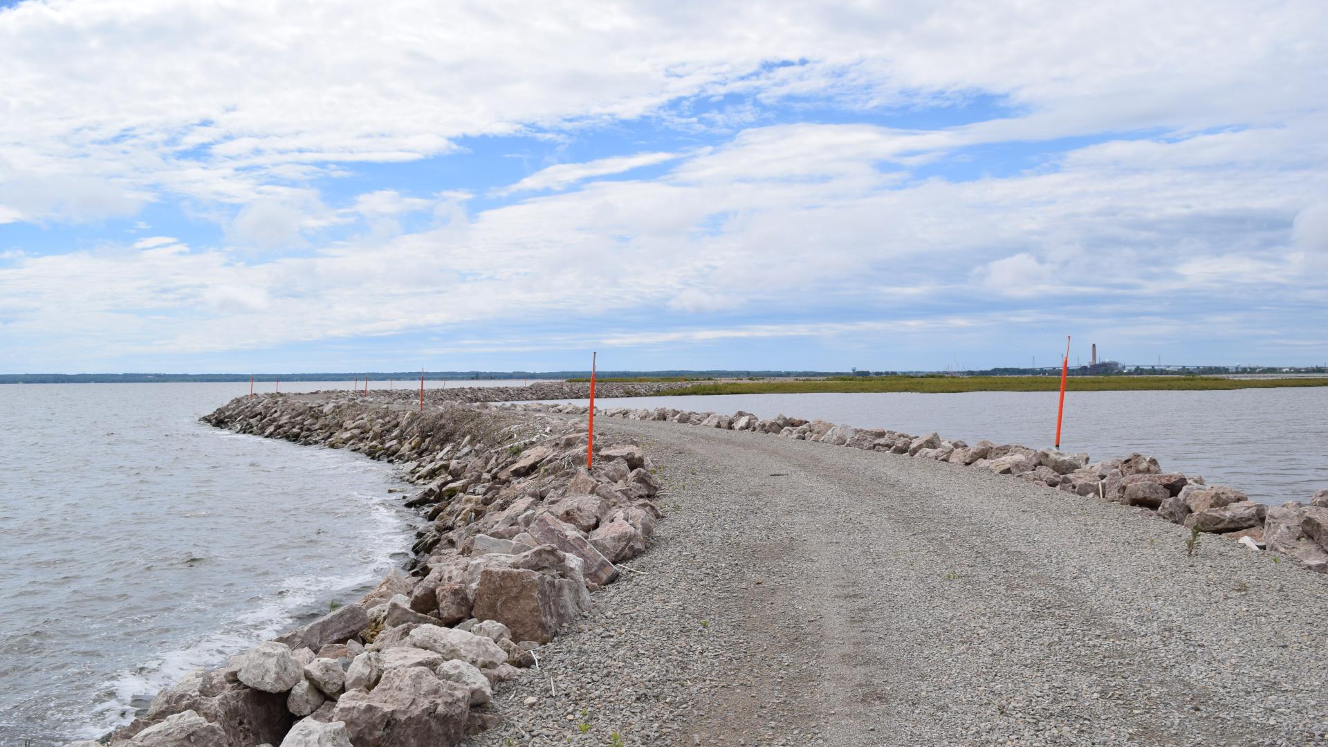 The 4.3 miles of stone dike is eight feet high and acts as a stone wave barrier and mold for the new islands.  Five perpendicular dikes, or “legs,” will separate three cells that will be used as a dredged material disposal facility (DMDF), with decades of capacity for the sediments from the lower portion of the navigation channel. Dredged materials deposited in the Cat Island DMDF over the coming years will gradually build three islands, expected to foster vegetation and habitat for fish and wildlife.