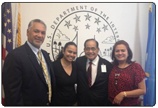 On Wednesday, July 18th, the Director of the Office of Insular Affairs (OIA), Nikolao Pula, hosted Benigno Fitial, Governor of the CNMI, for a meeting on various issues of importance to the people of the CNMI. Among these were the Tinian pier project and the dispute between the CNMI and U.S. Governments concerning taxation of Filipino and Korean non-resident aliens in the CNMI. The photograph above shows from left to right Nik Pula, Director of OIA, Norah LeDoux, OIA Intern, and the Governor and Mrs. Fitial. The daughter of parents from Pago Pago, American Samoa, Ms. LeDoux is working in OIA as an intern from the Asian Pacific American Institute for Congressional Studies (APAICS).