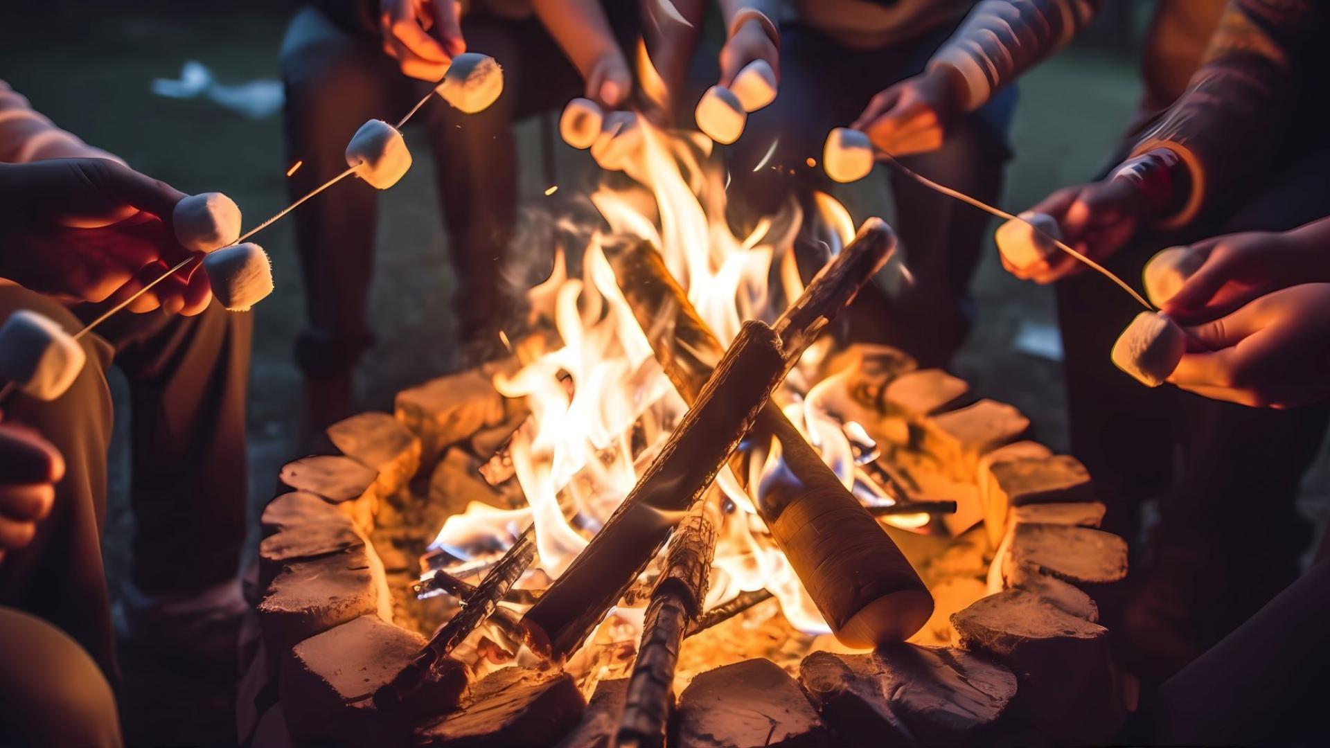 A group of people roast marshmallows around a campfire. Their hands hold sticks with marshmallows over a fire burning in a rock pit. Adobe Stock image.