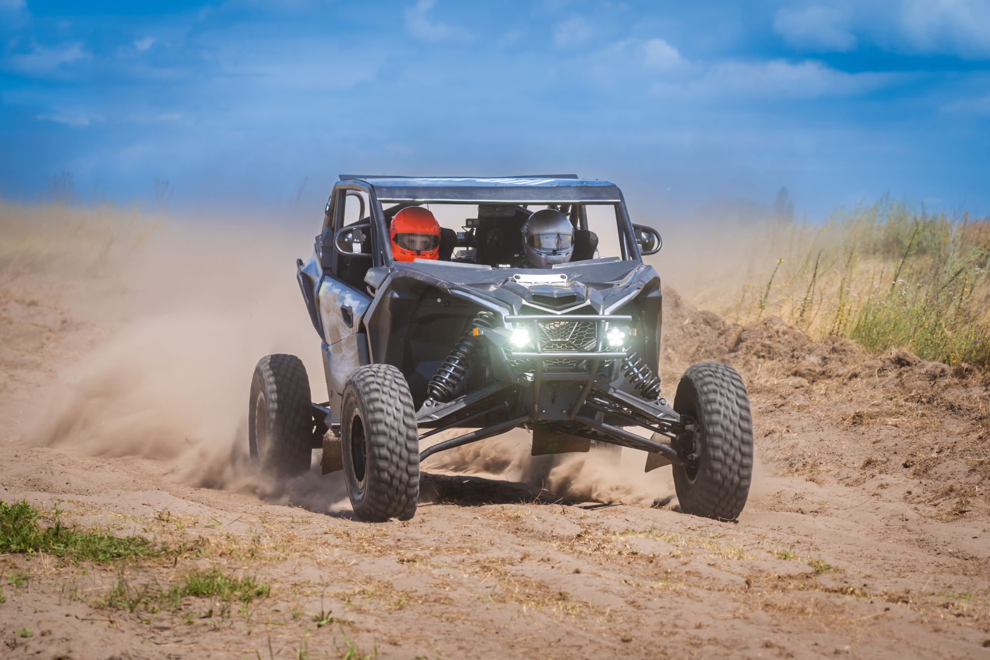 An all terrain vehicle drives on a dirt path. Two people inside are wearing helmets. Dust rises from the back of the vehicle on the dirt road.