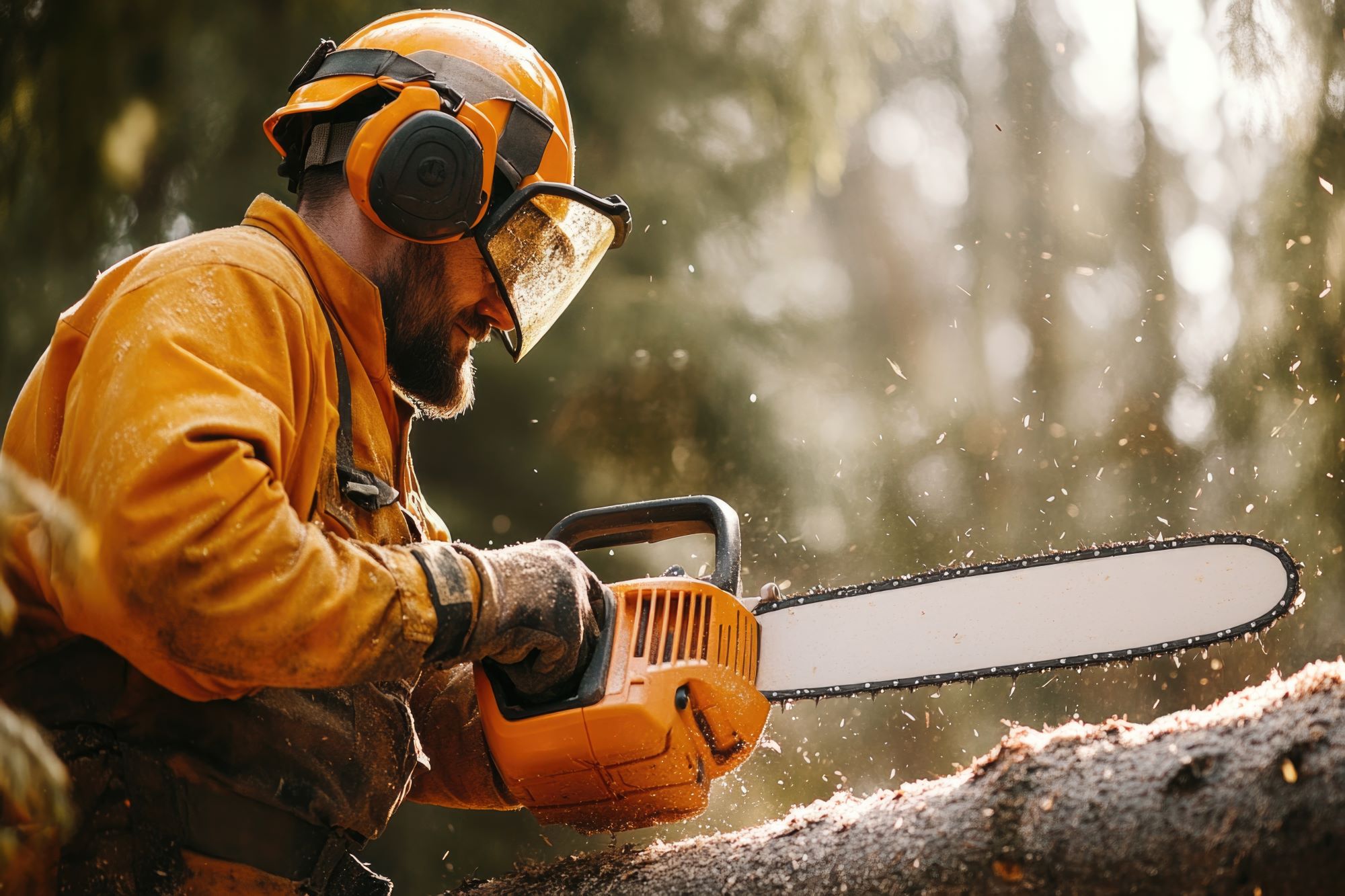 A man uses a chainsaw to cut a log. The chainsaw is orange and he wears an orange helmet with safety goggles and gloves.