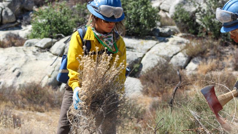 Civilian Conservation Corps volunteers clear brush along an access road near the US/Mexico border as part of the Southern Border Fuels Management Initiative. (James Gannon, Bureau of Land Management)